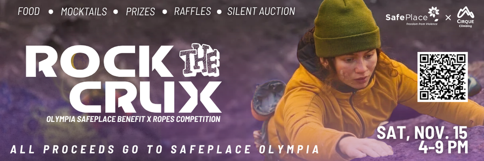 Cirque Climbing Gym is excited to host “Rock the Crux”, its 2nd annual SafePlace benefit public event on Saturday November 15th, 2025 from 4-9 pm. All proceeds for the event will go to support SafePlace in Olympia.