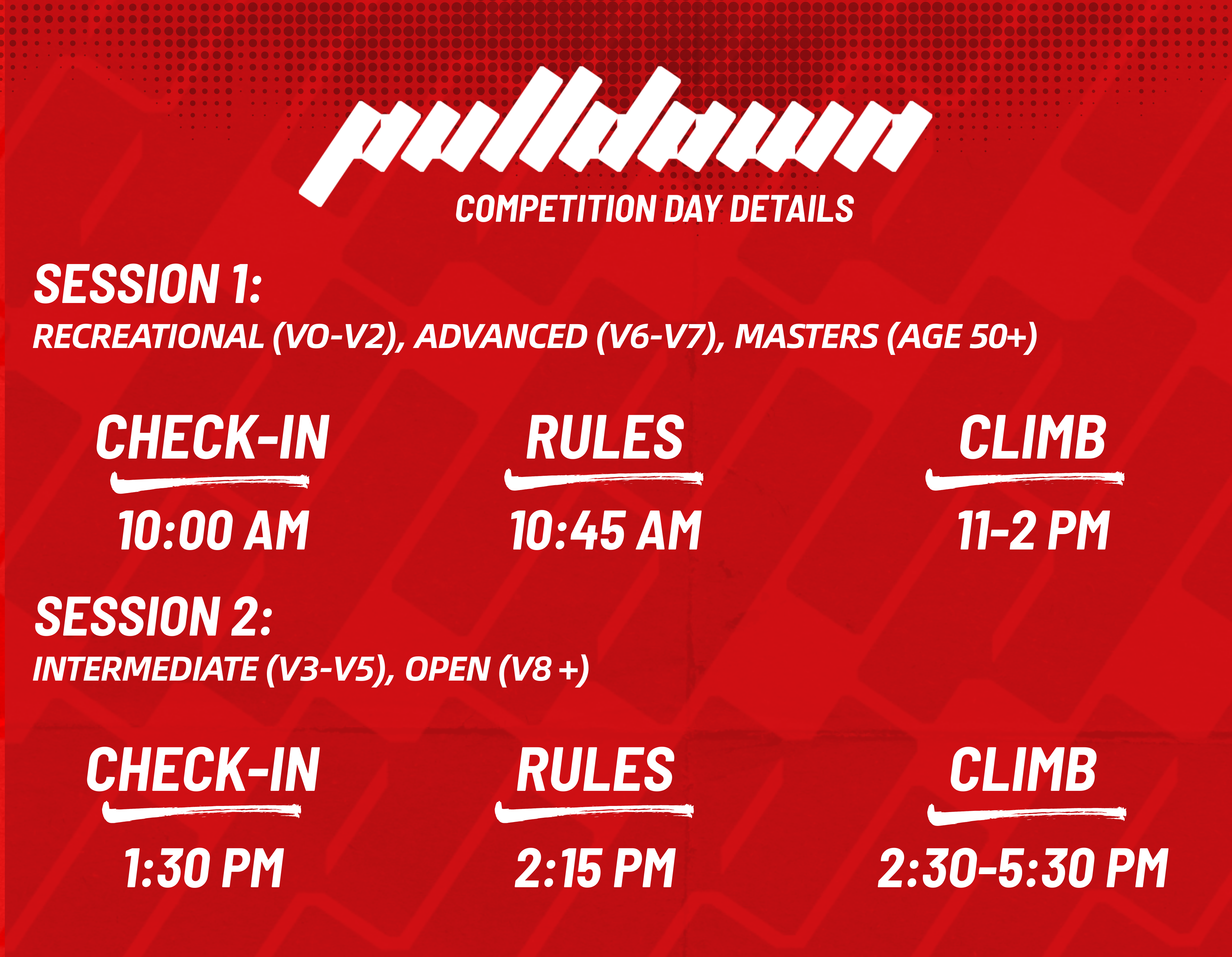 Not sure which category is right for you? Pulldown is a red-point style comp where competitors may attempt each problem as many times as they like within the allotted session time. When selecting your category, base your decision on the grade you are consistently projecting and sending. For example, someone projecting V6 should sign up for Advanced.